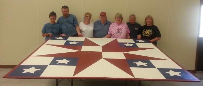 | Steve's Mom had wanted to paint a barn quilt and put it on their barn. The class she wanted to take was full so she had to wait but she never was able to take it. In August, Steve's sisters organized a group to gather together and paint a barn quilt in honor of Pearl. Sharon, Sonja, Steve, Veva, cousin Randy, Aunt Sara all helped paint the quilt. In October we were able to hang it on the barn. Sharon painted a gray brain cancer ribbon to honor her mother on it. Because of the way it was hung, it was sideways so I had to climb up two flights of scaffolds to repaint it. |